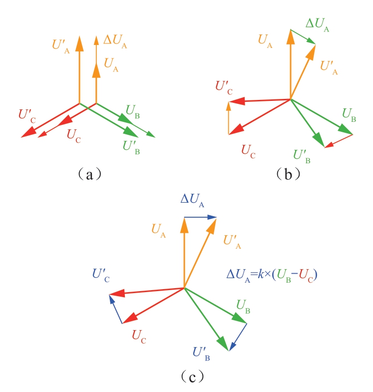 如图1(c)为利用其他两相的电气相量,对该相进行调相,由于其他两相的相量差为与本相正交的相量,利用它们的合成电压去产生一个电压增量ΔUA,该增量与UA正交,叠加到UA上以后的电压