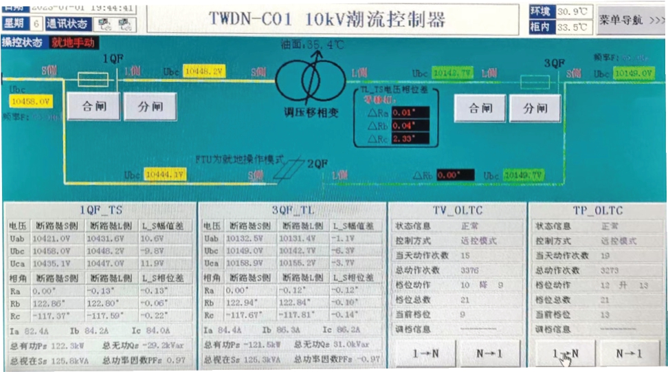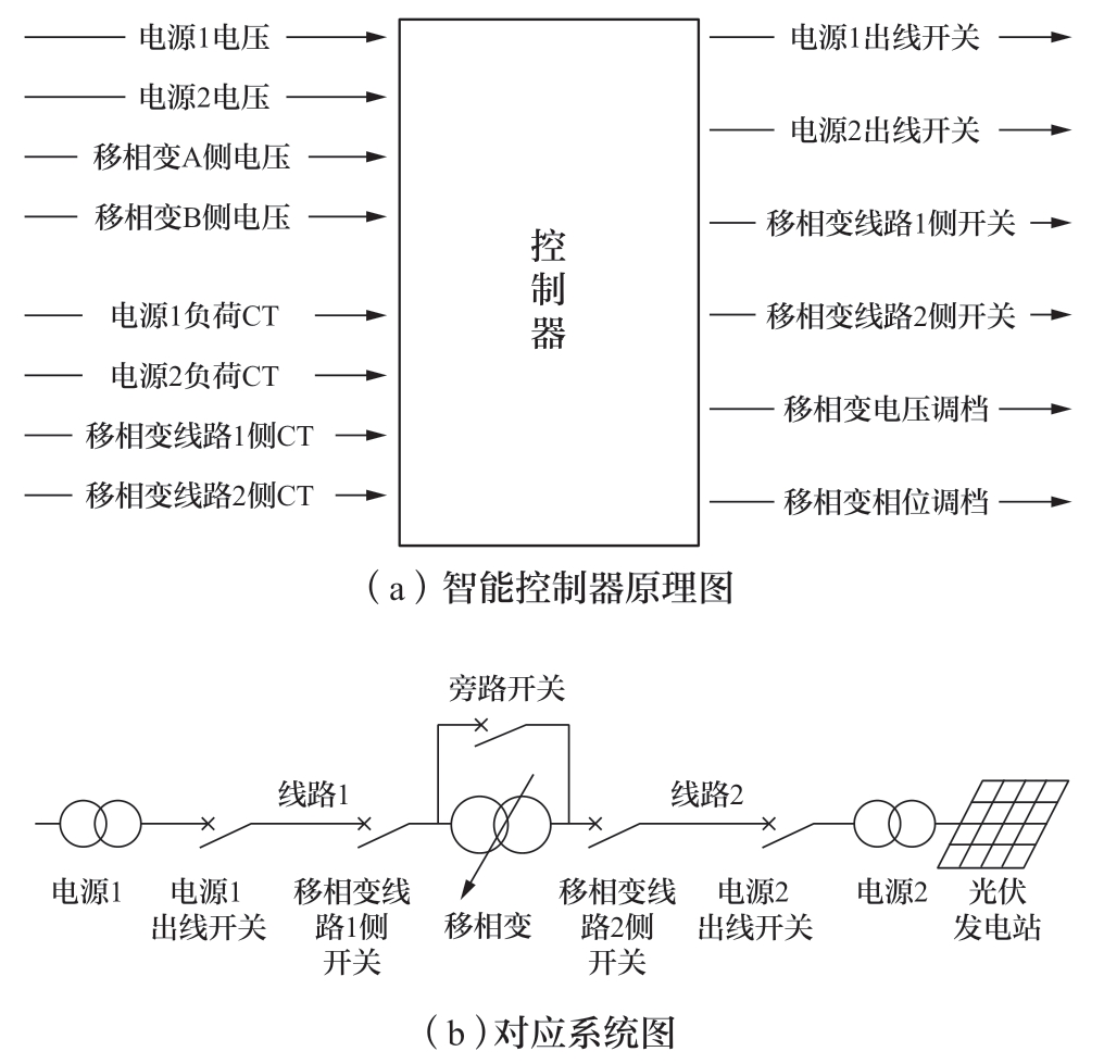 采用了智能控制策略。通过实时采集移相变压器输入侧和输出侧的三相电压、电流信号,以及有载分接开关的挡位和状态信息,同时结合移相变压器运行状态、过载能力等数据及移相变压器两侧线路的过载能力、负荷消耗及新能源发电厂的出力情况,通过智能控制实现移相变压器双侧线路的潮流可控转移,最大程度的优化线路负载分配、提高新能源发电厂的发电效率。