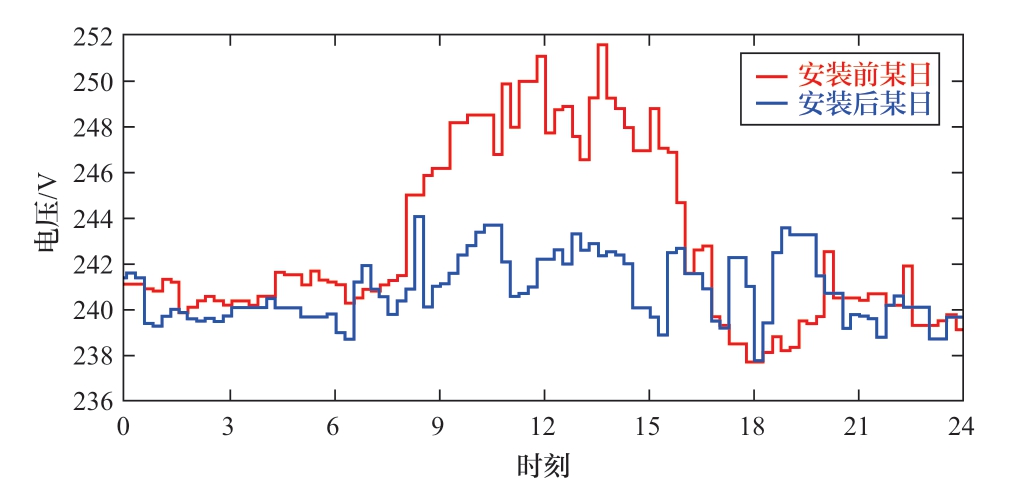 以上调压过程是通过智能控制器自动实现的,能够保证调压效果最优。移相变压器安装前后,居民侧的电压曲线如图10所示。