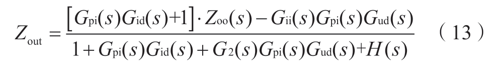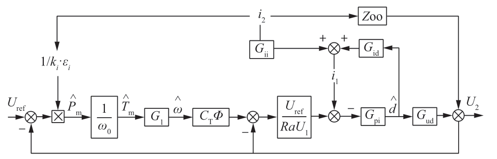 式中:ki、εi分别为调节系数和均衡因子,在稳定性分析中取(0,1)的正常数值;G1(s)为转子角速度ω对机械转矩Tm的传递函数;G2(s)与G3(s)的乘积为电枢电动势偏差ΔEa对母线电压偏差ΔU的传递函数;Zoo(s)为开环输出阻抗的传递函数;kp和kh为电流PI控制器的比例和积分系数。Gii(s)为输入电流对输出电流传递函数;Gpi(s)为比例积分系数。