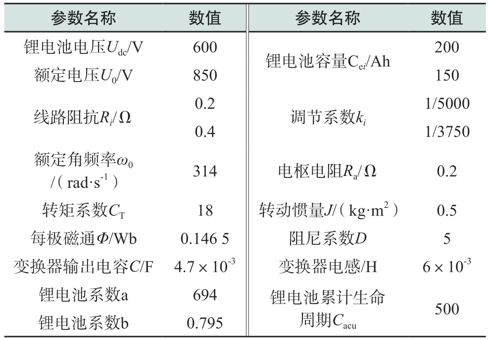 参数名称 数值 参数名称 数值锂电池电压Udc/V 600 锂电池容量Cei/Ah 200额定电压U0/V 850 150线路阻抗Ri/Ω 0.2 调节系数ki 1/5000 0.4 1/3750额定角频率ω0/ (rad·s-1) 314 电枢电阻Ra/Ω 0.2转矩系数CT 18 转动惯量J/ (kg·m2) 0.5每极磁通Φ/Wb 0.146 5 阻尼系数D 5变换器输出电容C/F 4.7×10-3 变换器电感/H 6×10-3锂电池系数a 694 锂电池累计生命周期Cacu 500锂电池系数b 0.795