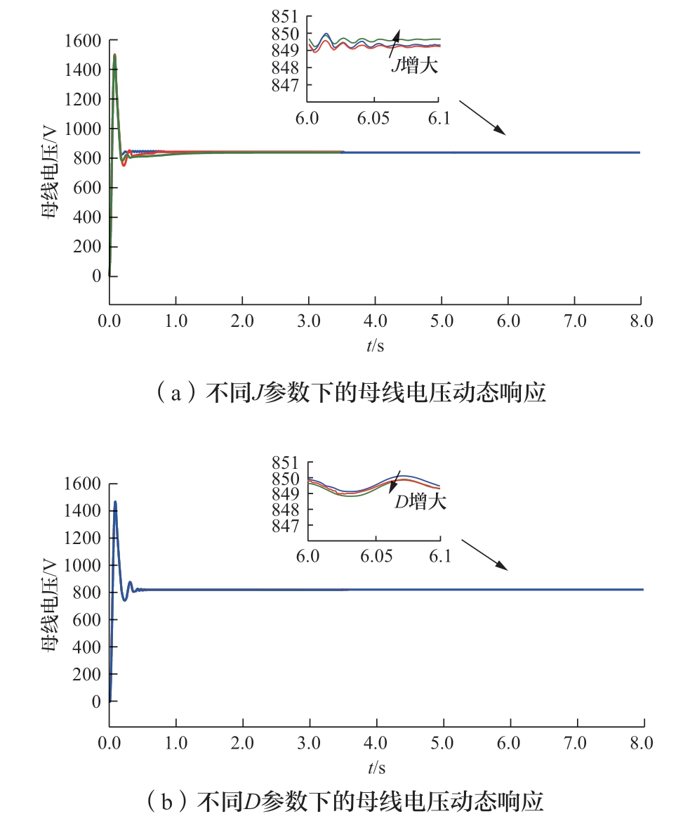 Fig.15 Dynamic response diagrams of bus voltage under different J, D parameters