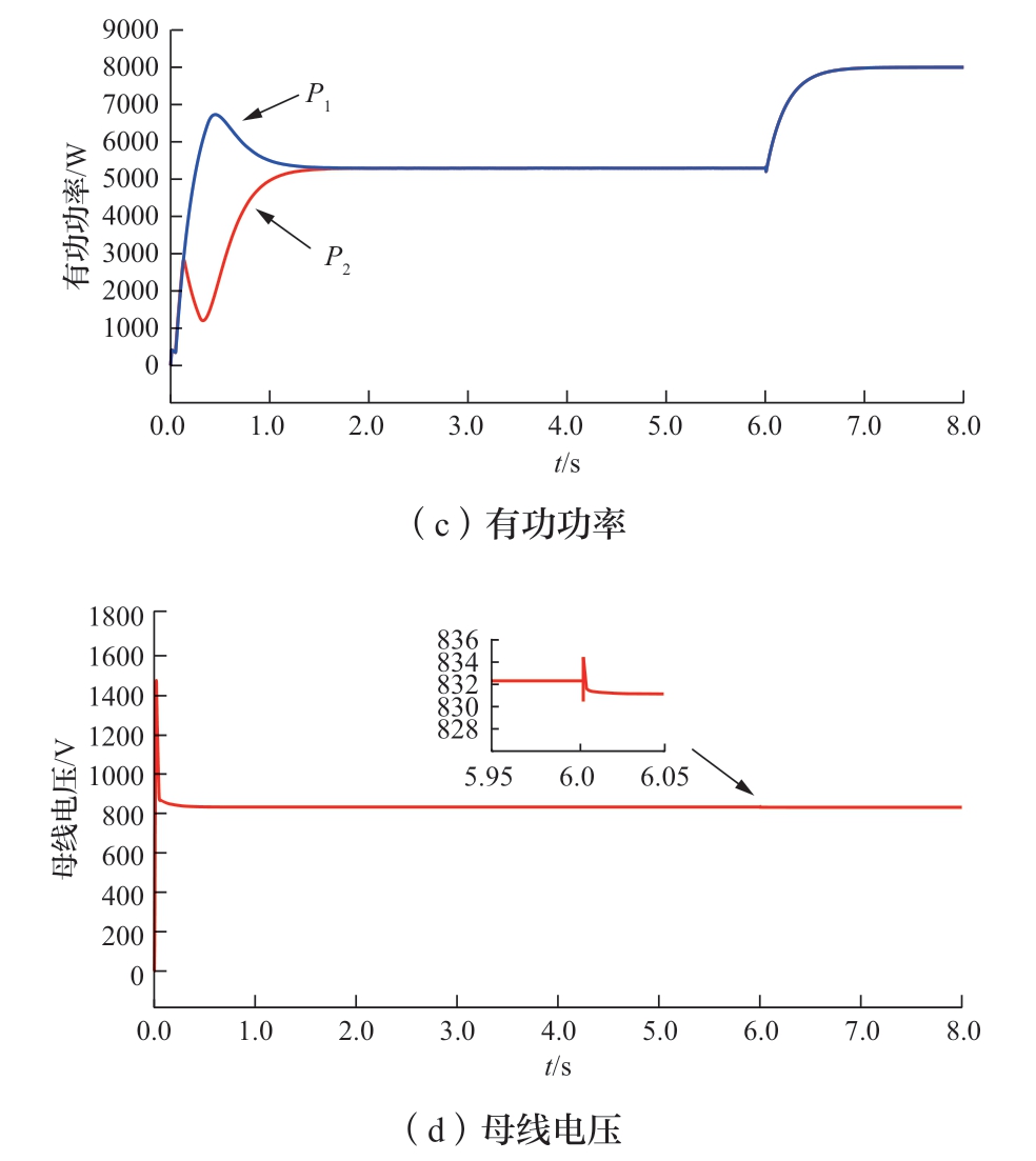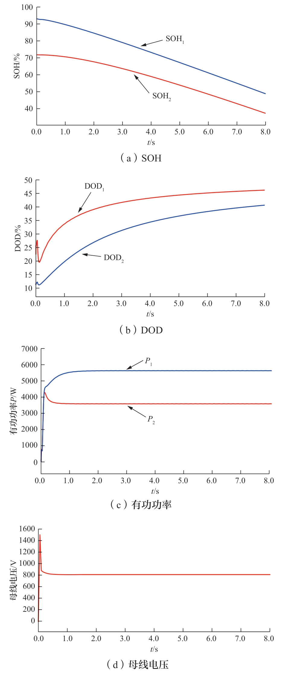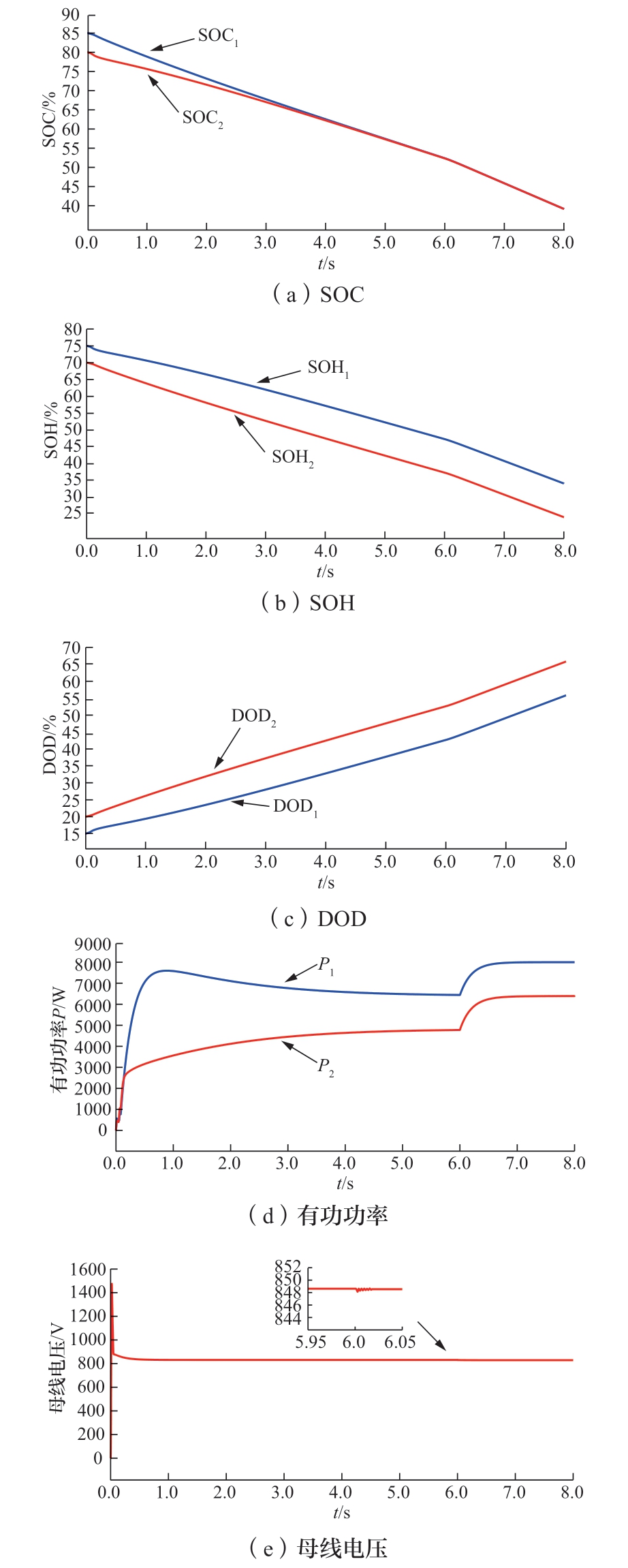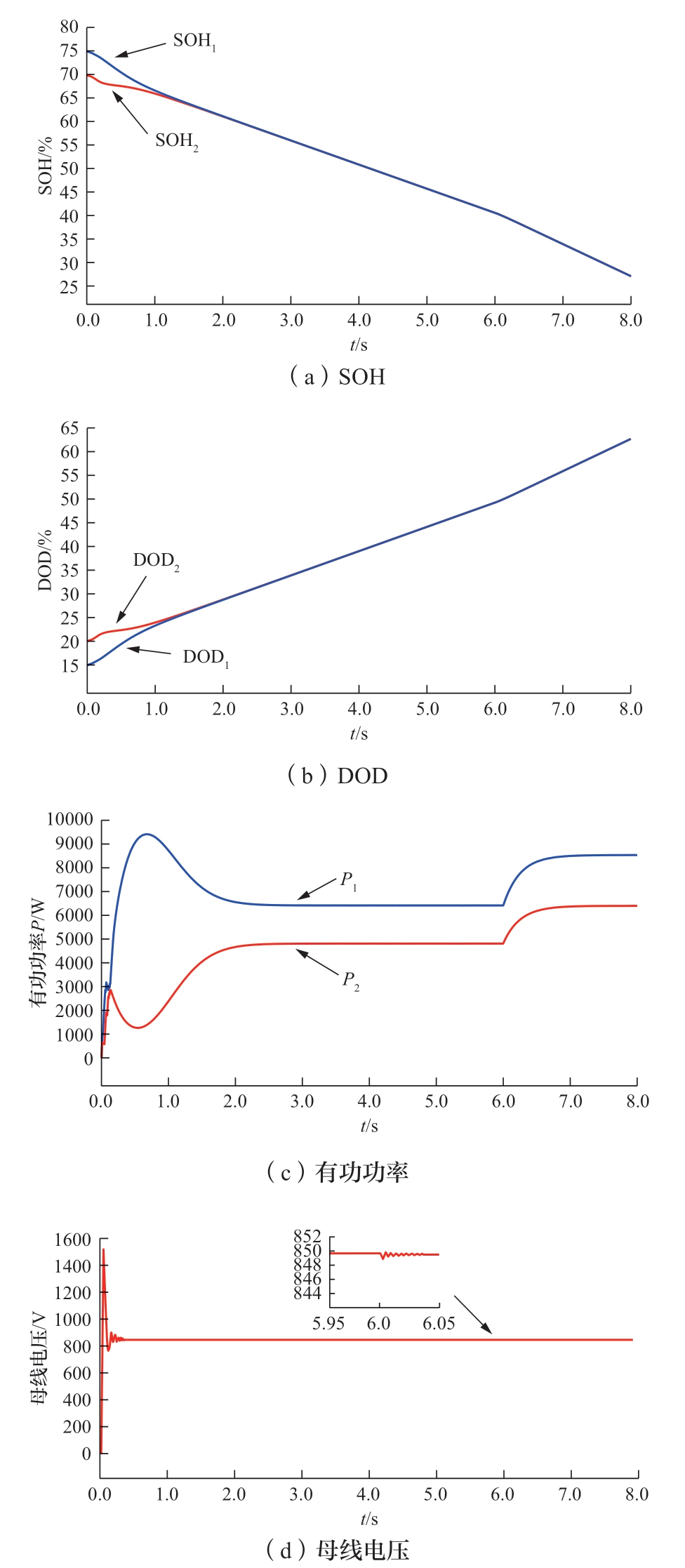 图2为传统VDCG控制下,2台容量分别为200 Ah、150 Ah锂电池并联运行仿真波形,在t=6.0 s时加重负荷。由于传统VDCG具有功率均分的控制效果,因此图2 (c) 中2条有功功率曲线逐渐重合,直至均分。此外,t=1.0 s前的暂态有功功率说明VDCG控制下微电网的惯性有了显著的提高。根据式 (4) 可知,由于在t1—t2时间段2台锂电池组有功功率超调不一致且对有功功率采用积分算法求出DOD,因此图2 (b) 中2条DOD曲线无法重合。若图2 (b) 中DOD不一致,结合式 (3) 可知,传统VDCG控制下无法使SOH均衡(见图2 (a))。此外,根据图2 (d) 显示,传统VDCG控制下无法维持电压稳定,母线电压与额定值相比跌了近20 V。