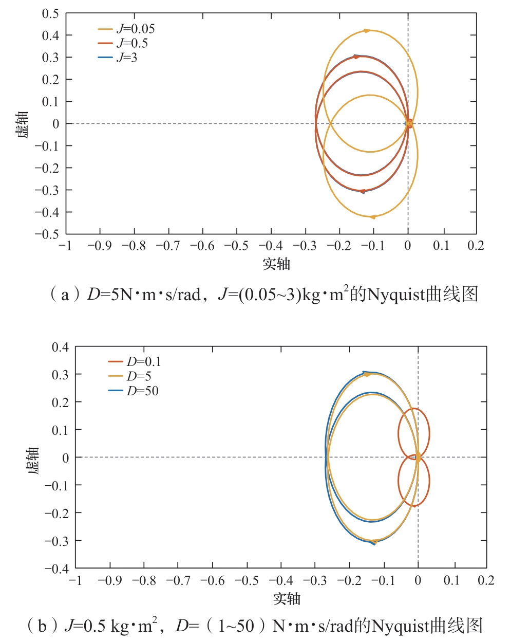 为进一步分析参数J和D对直流微电网系统的稳定性的影响,采用阻抗比判据[22-24],即通过直流微电网等效闭环输出阻抗Zo与负荷输入阻抗Zi的比值来判别稳定性,当阻抗比值的Nyquist曲线不包围(-1,0)时,则系统为稳定状态。其中Zo和Zi的表达式如下: