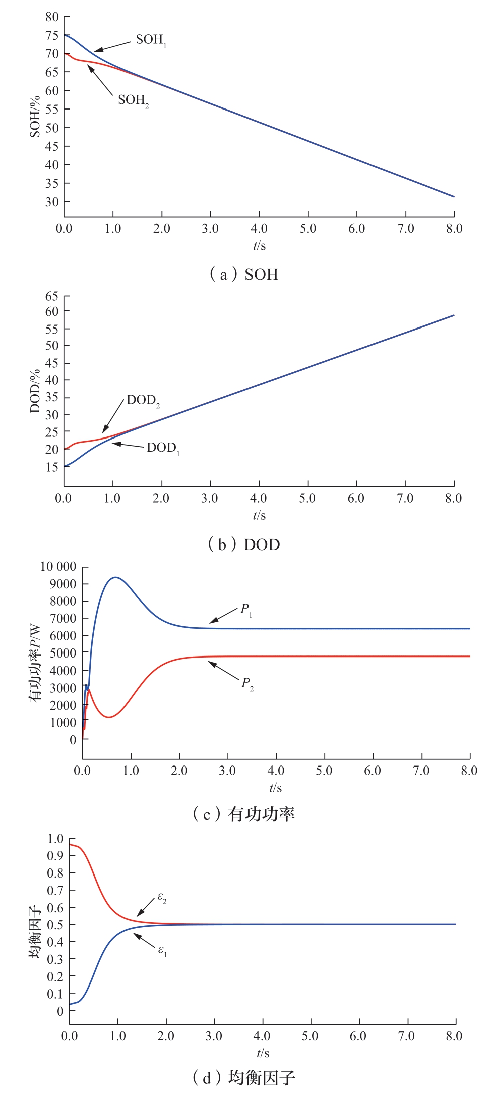 本文以2台容量分别为200 Ah、150 Ah锂电池组为例,分析所提控制方案实现SOH均衡原理。所提控制方案下SOH均衡过程如图4所示。假设在初始t时刻SOH1>SOH2 (见图4(a)),根据式 (3),则在t时刻DOD满足DOD1<DOD2。根据式 (6) 可知,在t+1时刻均衡因子ε满足ε1<ε2。根据式 (7) 可知,在均衡因子εi的调节下,SOH高的锂电池组能够输出更多的有功功率(见图4(c))。在所提算法的调节下,图4(b)中两条DOD曲线逐渐重合,DOD的变化量ΔDOD(ΔDOD=DOD(t+1)- DOD(t)满足ΔDOD1>ΔDOD2,这表示健康程度良好(即SOH高)的DOD变化量更大,处于深度放电状态。在DOD参数的影响下,根据式 (6),ε1在逐渐增大,ε2在逐渐减小(见图4 (d))。随着调节过程的进行,2条DOD和ε曲线趋于一致。当ε1=ε2时,根据式 (6),满足DOD1=DOD2,同时SOH达到均衡(见图4(a))。