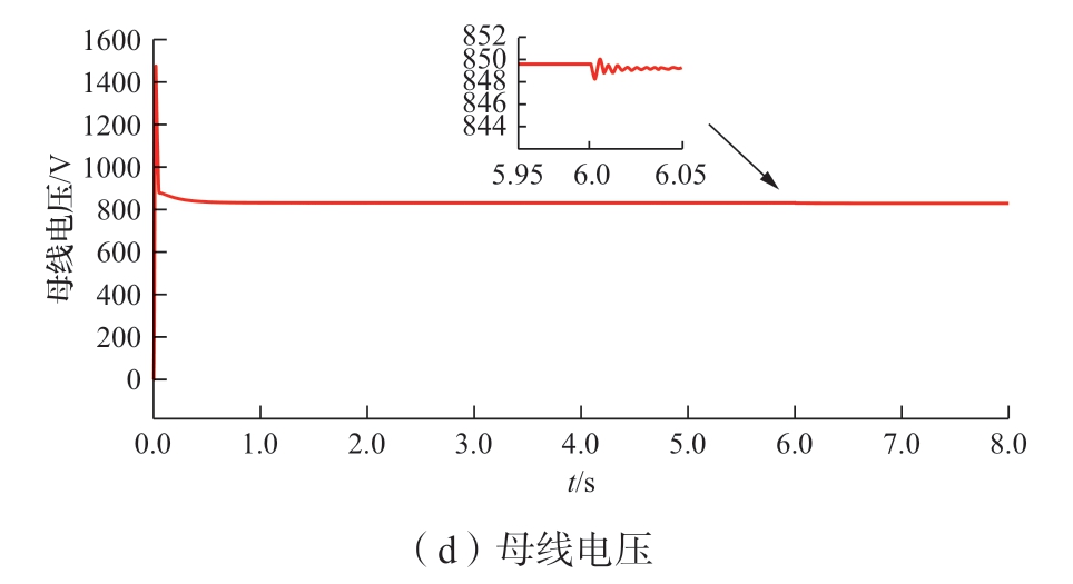 直流微电网的稳定运行要求所提方案对干扰具备较强的鲁棒性。J和D参数会影响系统的鲁棒性,为此,在工况6中 J和D参数发生了变化,并以电压变量为例,验证所提方案的鲁棒性。图15说明在t=6.0 s时负载功率突然增大10 kW,母线电压无明显下降,经过约0.1 s的波动恢复至稳定值。说明J和D参数在一定范围内波动时,所提方案具有良好的鲁棒性。