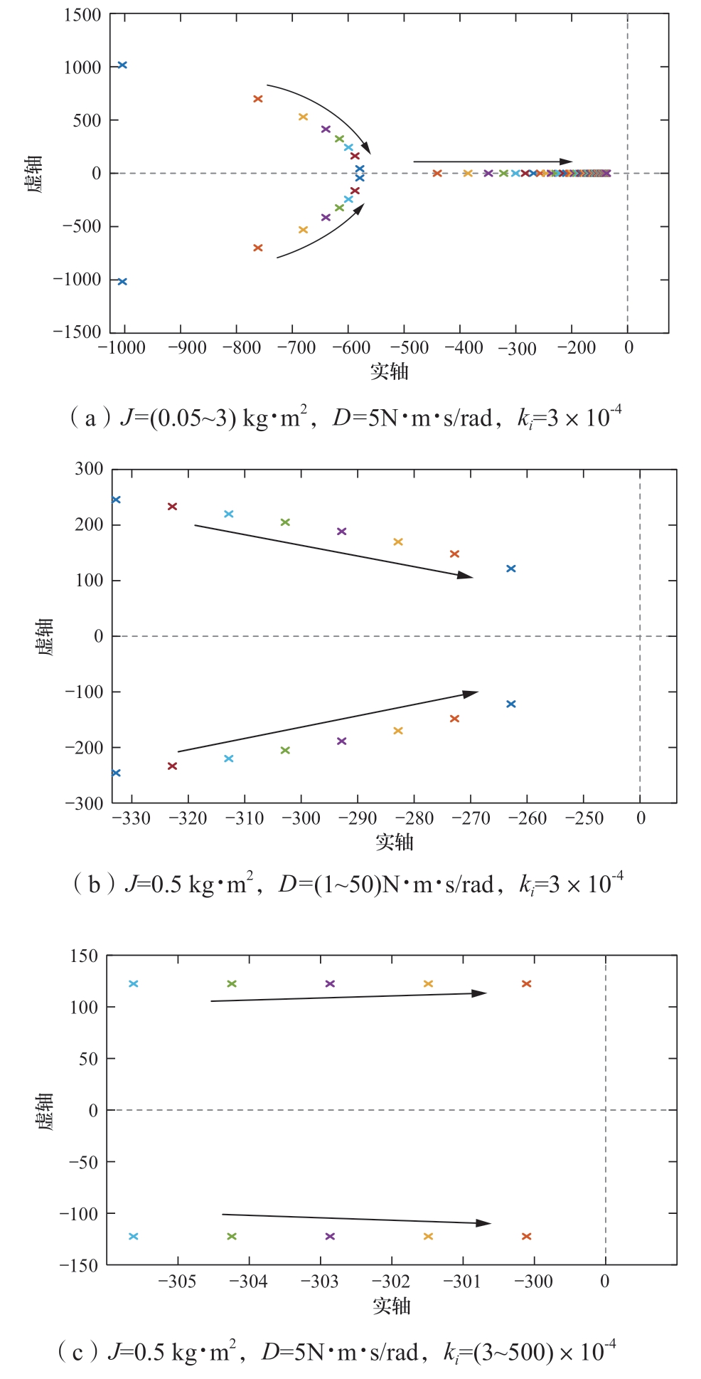 根据式(12)绘制不同转动惯量J、阻尼系数D、调节系数ki下的主导极点图,如图8所示。由于主导极点决定系统稳定运行[21],因此图8显示了不同控制参数下主导极点变化图。当J、D、ki较小时,图8中主导极点的根轨迹都在虚轴左半边稳定区域,但随着J、D、ki参数不断增大,主导极点逐渐靠近虚轴右半边的不稳定区域,造成系统不稳定运行。因此,需要选择合适的J、D、ki参数使主导极点位于虚轴左半边稳定区域,保证系统稳定运行。