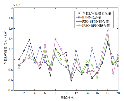 综合来看,无论是对于训练样本的拟合效果还是对测试样本的预测效果,IPSO-BPNN都比BPNN和PSO-BPNN要更加优越,表明IPSO-BPNN模型具有很强的学习能力和泛化能力;并且基于IPSO-BPNN对测试样本的单位kW投资进行预测的平均绝对百分比误差为12.73%,预测精度较高。