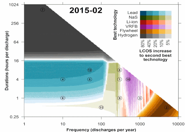 另一个LCOS影响因素是放电持续时间。在年循环次数相近的应用场景下,更长放电时间的应用场景具有更低的LCOS。一项储能技术放电持续时间的增长将导致放电量的增加,但是总投资成本的增加相对较少,因为这仅影响能量成本,而功率成本却未受到影响。