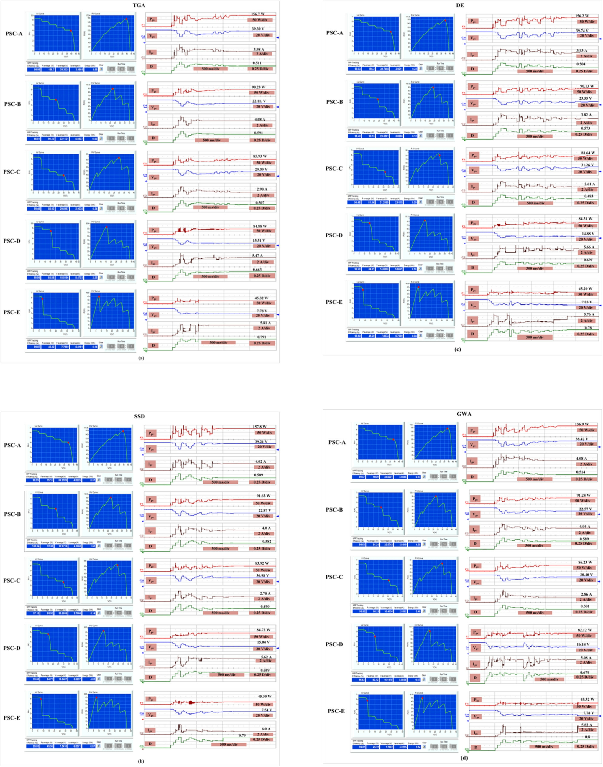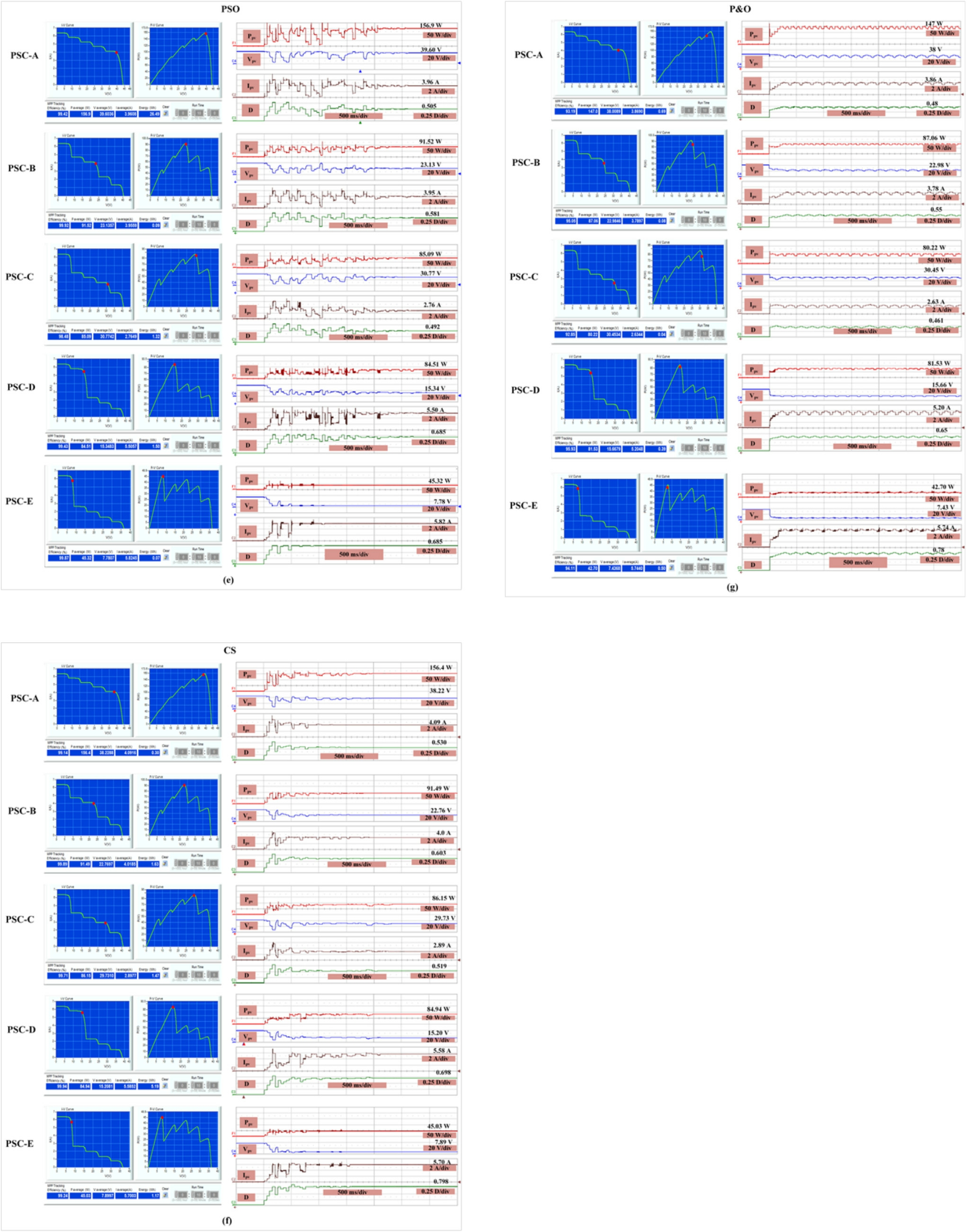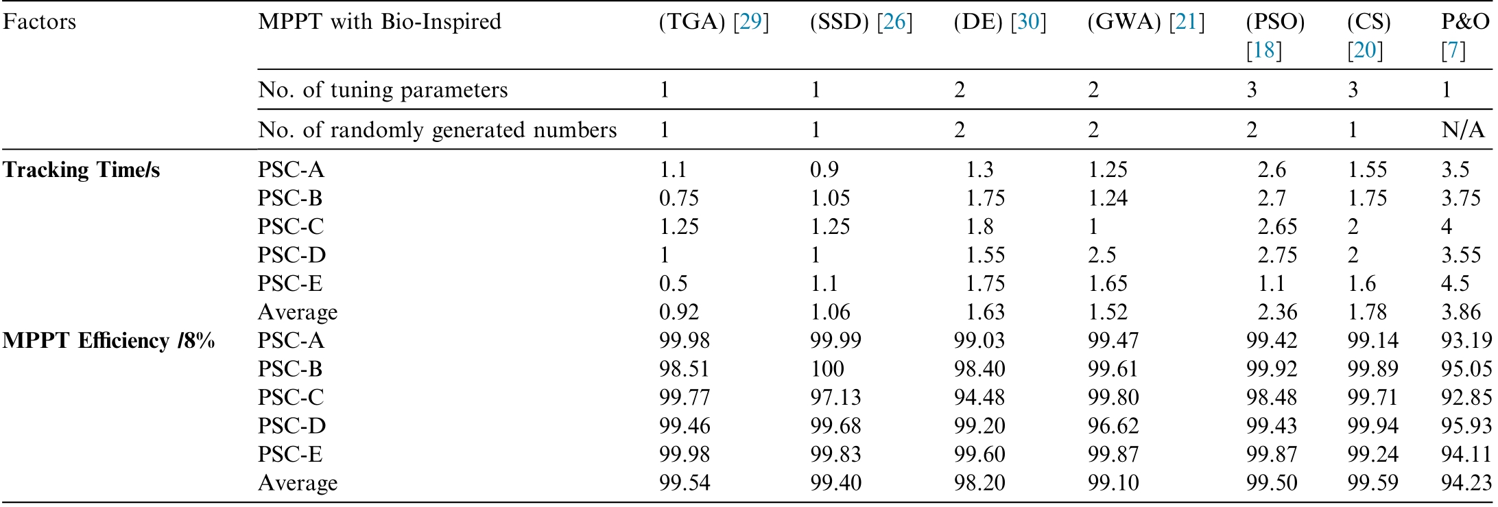 Factors MPPT with Bio-Inspired (TGA) [29] (SSD) [26] (DE) [30] (GWA) [21] (PSO)[18]P&O[7]No.of tuning parameters 1 1 2 2 3 3 1 No.of randomly generated numbers 1 1 2 2 2 1 N/A Tracking Time/s PSC-A 1.1 0.9 1.3 1.25 2.6 1.55 3.5 PSC-B 0.75 1.05 1.75 1.24 2.7 1.75 3.75 PSC-C 1.25 1.25 1.8 1 2.65 2 4 PSC-D 1 1 1.55 2.5 2.75 2 3.55 PSC-E 0.5 1.1 1.75 1.65 1.1 1.6 4.5 Average 0.92 1.06 1.63 1.52 2.36 1.78 3.86 MPPT Efficiency /8% PSC-A 99.98 99.99 99.03 99.47 99.42 99.14 93.19 PSC-B 98.51 100 98.40 99.61 99.92 99.89 95.05 PSC-C 99.77 97.13 94.48 99.80 98.48 99.71 92.85 PSC-D 99.46 99.68 99.20 96.62 99.43 99.94 95.93 PSC-E 99.98 99.83 99.60 99.87 99.87 99.24 94.11 Average 99.54 99.40 98.20 99.10 99.50 99.59 94.23(CS)[20]