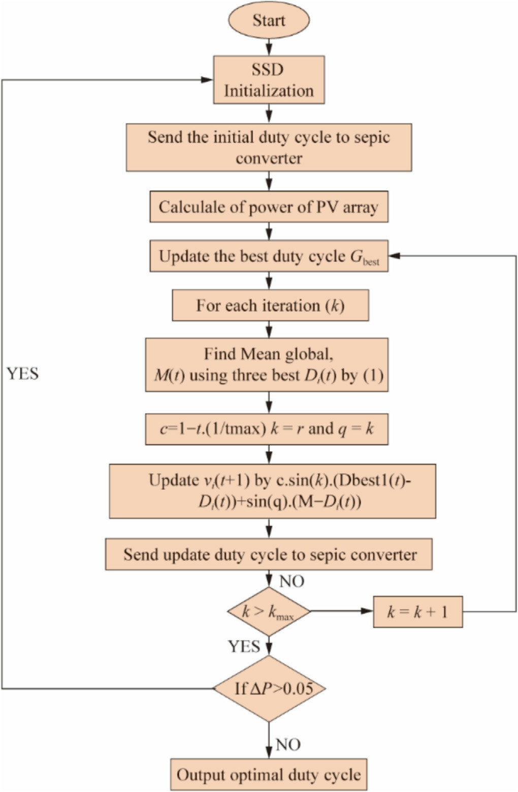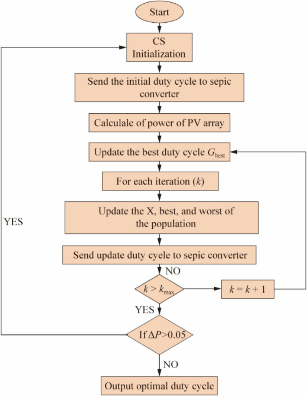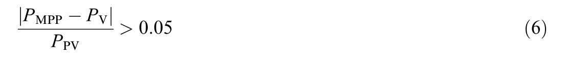 Once the global maximum power was tracked,the algorithm continuously monitored the system based on Eq.(6).The algorithm continues its operation if the specified condition is not satisfied.Conversely, if the condition in Eq.(6) is fulfilled, it indicates that the system has encountered either a change in the irradiance or a variation in the load.