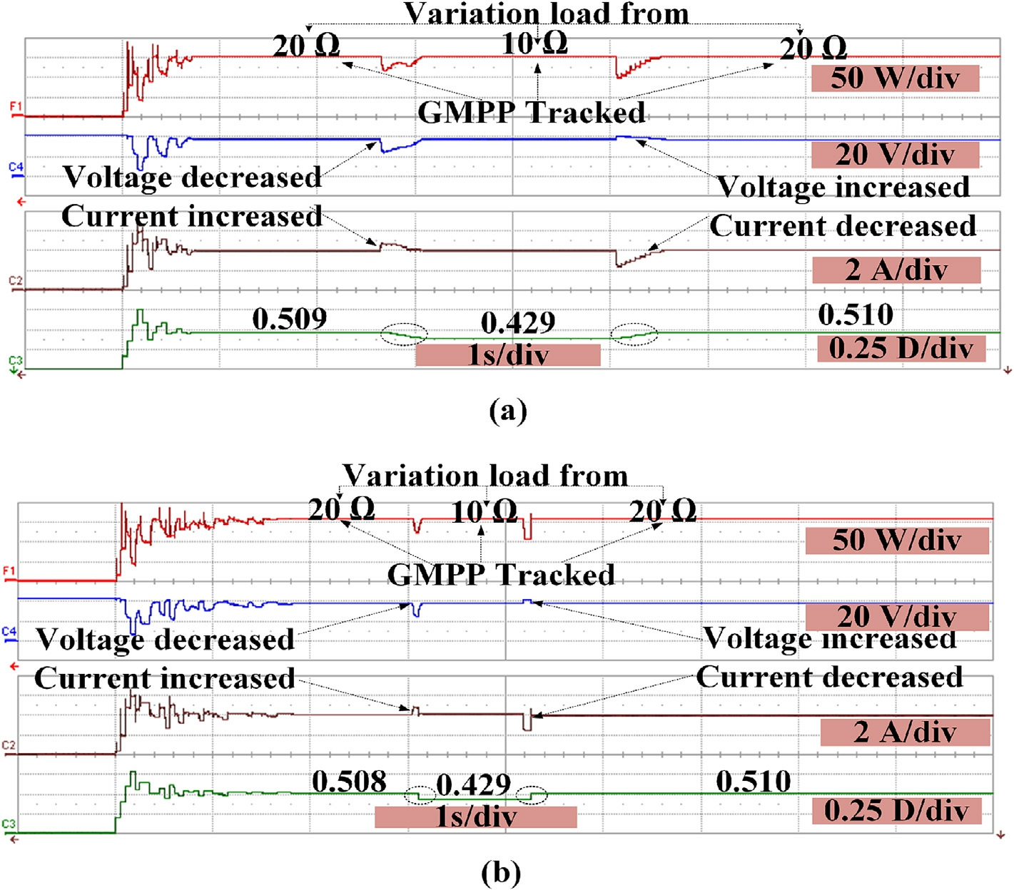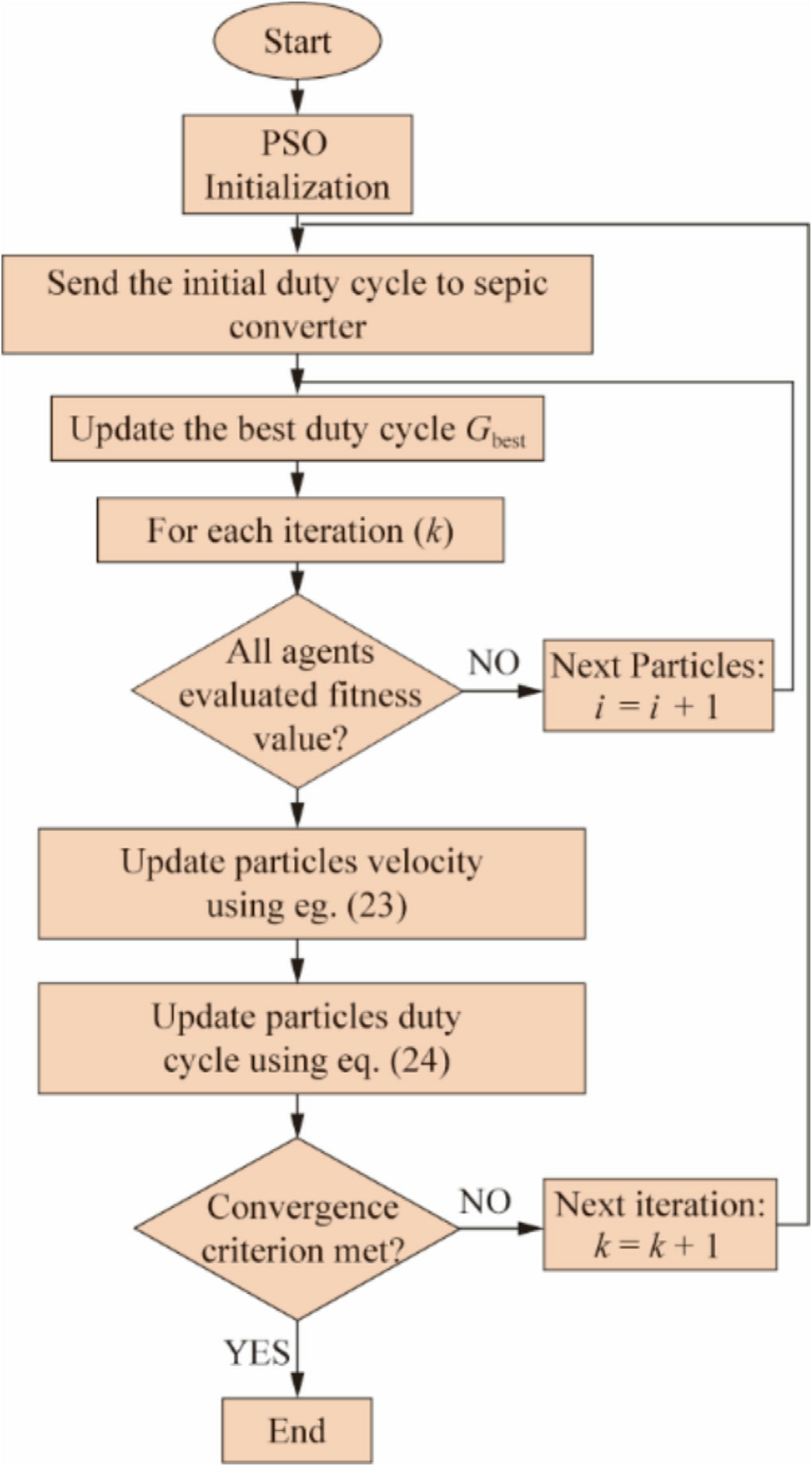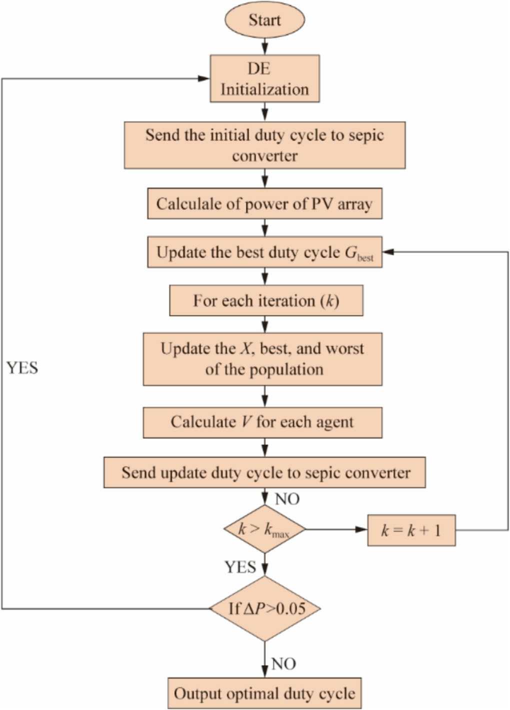 Additionally, several methods have been developed to differentiate between changes in the irradiance and variations in the load, thereby enabling algorithms to prevent re-initialization during load fluctuations.An adaptive tracking method that effectively returns to the maximum power point (MPP) without requiring re-initialization by using an adaptive step-size perturbation (ΔD) was developed in references [23,24].Decreasing the step size increases, the tracking time, which may cause oscillations.In particular, an impedance conversion equation was developed for the DC-DC converter By using the improved differential evolution (IDE) approach [30].This enables the converter to trace back to the GMPP [9],thereby eliminating the requirement for particle reinitialization during the load changes.However, this approach requires adjustment of the equations when the converter design is changed.