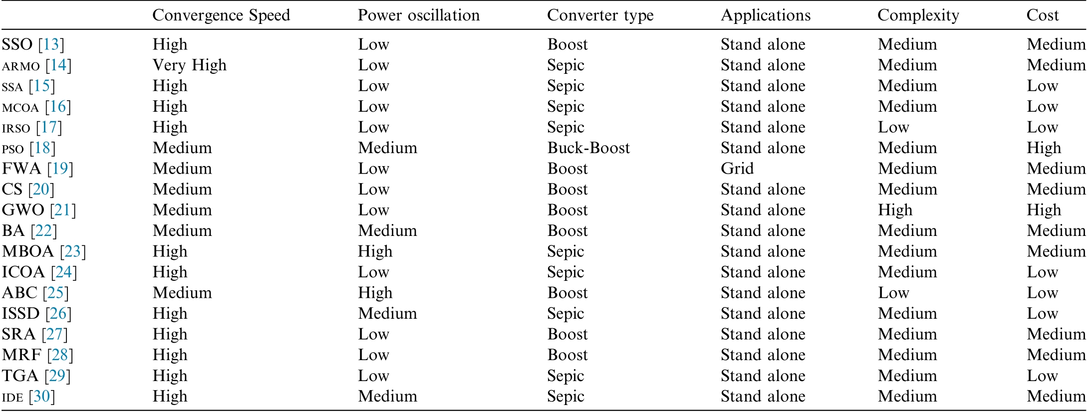 Convergence Speed Power oscillation Converter type Applications Complexity Cost SSO [13] High Low Boost Stand alone Medium Medium ARMO [14] Very High Low Sepic Stand alone Medium Medium SSA [15] High Low Sepic Stand alone Medium Low MCOA [16] High Low Sepic Stand alone Medium Low IRSO [17] High Low Sepic Stand alone Low Low PSO [18] Medium Medium Buck-Boost Stand alone Medium High FWA [19] Medium Low Boost Grid Medium Medium CS [20] Medium Low Boost Stand alone Medium Medium GWO [21] Medium Low Boost Stand alone High High BA [22] Medium Medium Boost Stand alone Medium Medium MBOA [23]ICOA [24]Medium Low ABC [25] Medium High Boost Stand alone Low Low ISSD [26] High Medium Sepic Stand alone Medium Low SRA [27] High Low Boost Stand alone Medium Medium MRF [28] High Low Boost Stand alone Medium Medium TGA [29] High Low Sepic Stand alone Medium Low IDE [30] High Medium Sepic Stand alone Medium Medium High High High Low Sepic Sepic Stand alone Stand alone Medium Medium