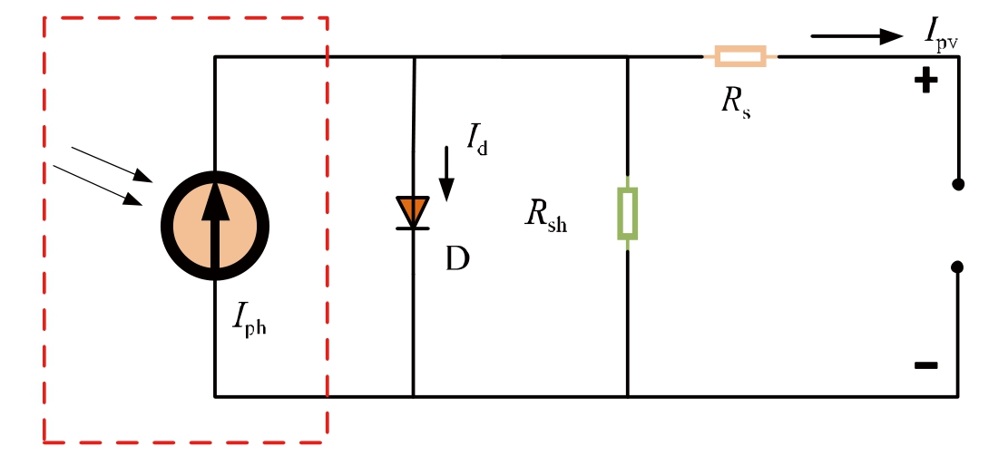 PV modules convert solar energy into electrical energy using the PV effect in semiconductor materials.A PV module comprises an extensive PN junction.When sunlight reaches the surface of the PV module, it energizes the free charge carriers within the semiconductor, prompting their movement.This movement creates varying potential differences across the different areas of the module,thereby generating an electric current.We applied the principles of electronic circuit theory to derive an equivalent circuit model and formulate the output characteristic equationsfor the PV modules.Fig.1 depicts the corresponding circuit representation.