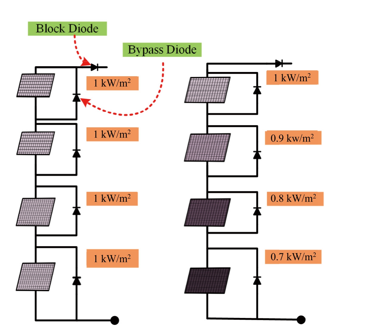 In typical PV systems, multiple solar cells are linked in series or parallel to form modules and arrays.However,partial shading can adversely affect these systems since PV modules may suffer from a decrease in the voltage and current output when they are shaded.The decrease in the power production can cause the shaded modules to act more like loads rather than producing power,which would reduce the overall power output of the string.This is the standard procedure for installing bypass diodes in parallel with each PV module to offset this decline in performance.Even when one or more modules are shaded,this arrangement ensures that energy will continue to flow through the string.[32].Furthermore, blocking diodes are included to prevent the reversal of the current flow caused by the voltage differentials between the strings linked in parallel.