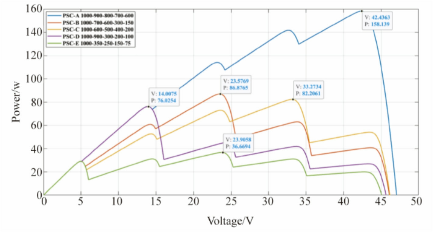 In PV solar cells, the I-V curve depicts the relationship between the output voltage and current of the cell under specific solar irradiance conditions.Changes in the solar irradiance alter the I-V curve, causing the operating point of the cell to shift along the curve.Fig.4 depicts the I-V curves for the three PV strings, PSC-A, PSC-B, and PSC-C,under the varying solar irradiance levels,as generated using MATLAB Simulink based on the developed model.Initially, for PSC-A, the MPP is located on the load line, with a voltage, Vmpp, of 38.96 V and a current,Impp of 1.36 A.When the shading pattern shifts from PSC-A to PSC-B, higher voltage and current values of28.15 V and 1.16 A, respectively, are obtained when compared with the tracked values under PSC-A.This behavior concurs with that shown in Eq.(5), which demonstrates that variations in the solar irradiance directly affect the voltage (VPV) and current (IPV) levels within the PV system.