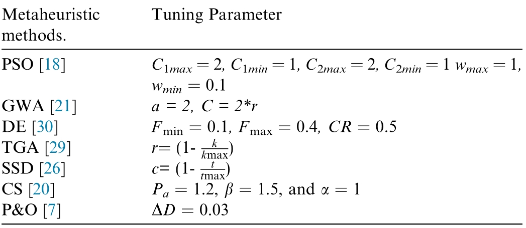 Metaheuristic methods.Tuning Parameter PSO [18]GWA [21] a = 2, C = 2*r DE [30] Fmin = 0.1, Fmax = 0.4, CR = 0.5 C1max=2,C1min=1,C2max=2,C2min=1 wmax=1,wmin = 0.1 TGA [29] r= (1- k kmax)SSD [26] c= (1- t tmax)CS [20] Pa = 1.2, β = 1.5, and α = 1 P&O [7] ΔD = 0.03