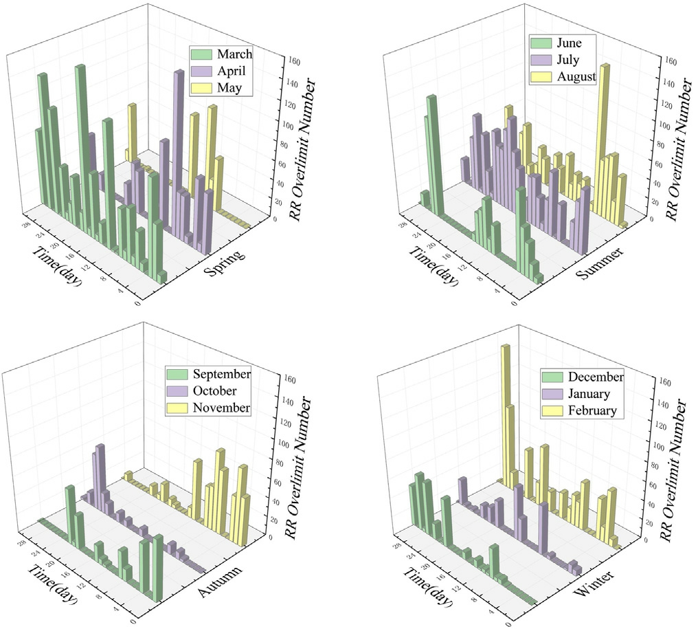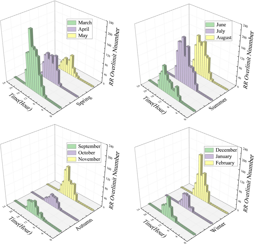 The RR overrun conditions are most likely to occur in the period between 9:00 and 17:00.The RR overrun interval segments are more frequent in spring and summer,and relatively rare in winter and fall.