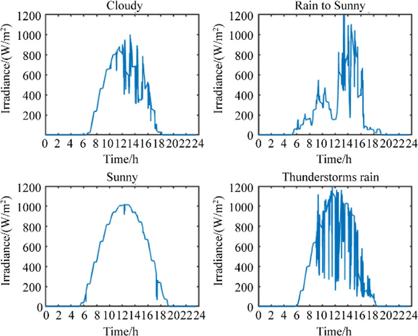 PV is an intermittent energy source, which may cause voltage fluctuations, voltage increase, reverse power flow,voltage flicker,grid-side power fluctuations,and frequency fluctuations when connected to the grid.This negative effect is caused by variations in the solar radiation.The solar radiation represents time series data that fluctuates based on the days, hours, minutes, and sometimes even seconds.Additionally,rainfall,cloud movement,and variations in the weather conditions cause frequent changes in the solar radiation.