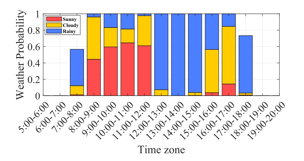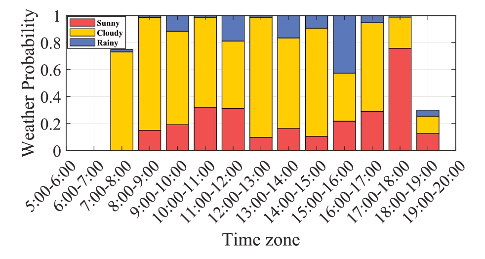 Figs.14 and 15 depict the results of the meteorological probability calculations for two typical days in February(dates of frequent PV power overrun events).We compared the specific time periods for RR overruns in Figs.10 and 11.The data analysis demonstrates that the RR overruns are not severe in the period between 12:00 and 15:00 on February 23rd,where rainy weather is persistent,and in the period between 12:00 and 13:00 on February 28th,when the weather is cloudy.Conversely, during the other periods, the weather type switched frequently between sunny, rainy, and cloudy weather, presenting drastic fluctuations in the PV output.Therefore, the region is prone to RR overruns due to high-impact weather types in the period between 9:00 and 17:00 throughout the day in February.However, the magnitude of PV power fluctuation is relatively small, for the cloudy weather observed in the period between 12:00 and 13:00 and the continuous rainy weather observed in the period between 12:00 and 15:00; this prevents large-scale RR overruns.The specifics of the other months and time periods can also be analyzed using this method.
