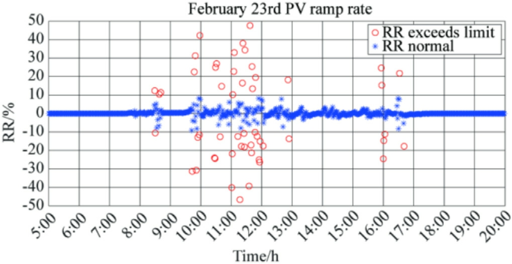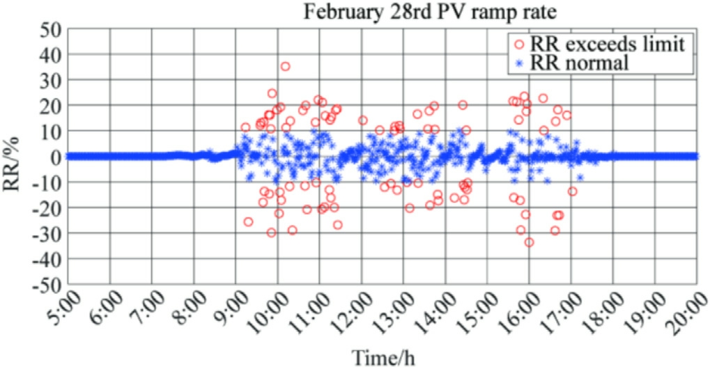 The red circles in Figs.10 and 11 represent the RR overruns, and the blue circles indicate the points within the 10% RR standard limit.The power fluctuations in the region were observed to be more intense on February 23rd from 9:00 to 12:00.Additionally,for most of the time on February 28th, i.e., from 9:00 to 17:00, it is in the period of RR overruns; however, the least RR overruns were observed in the period from 12:00 to 13:00.