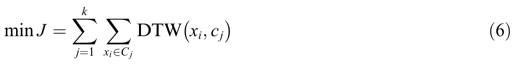 To make the improved DTW-K-means algorithm converge within a finite number of steps, the objective function is defined to minimize the total DTW distance within each cluster: