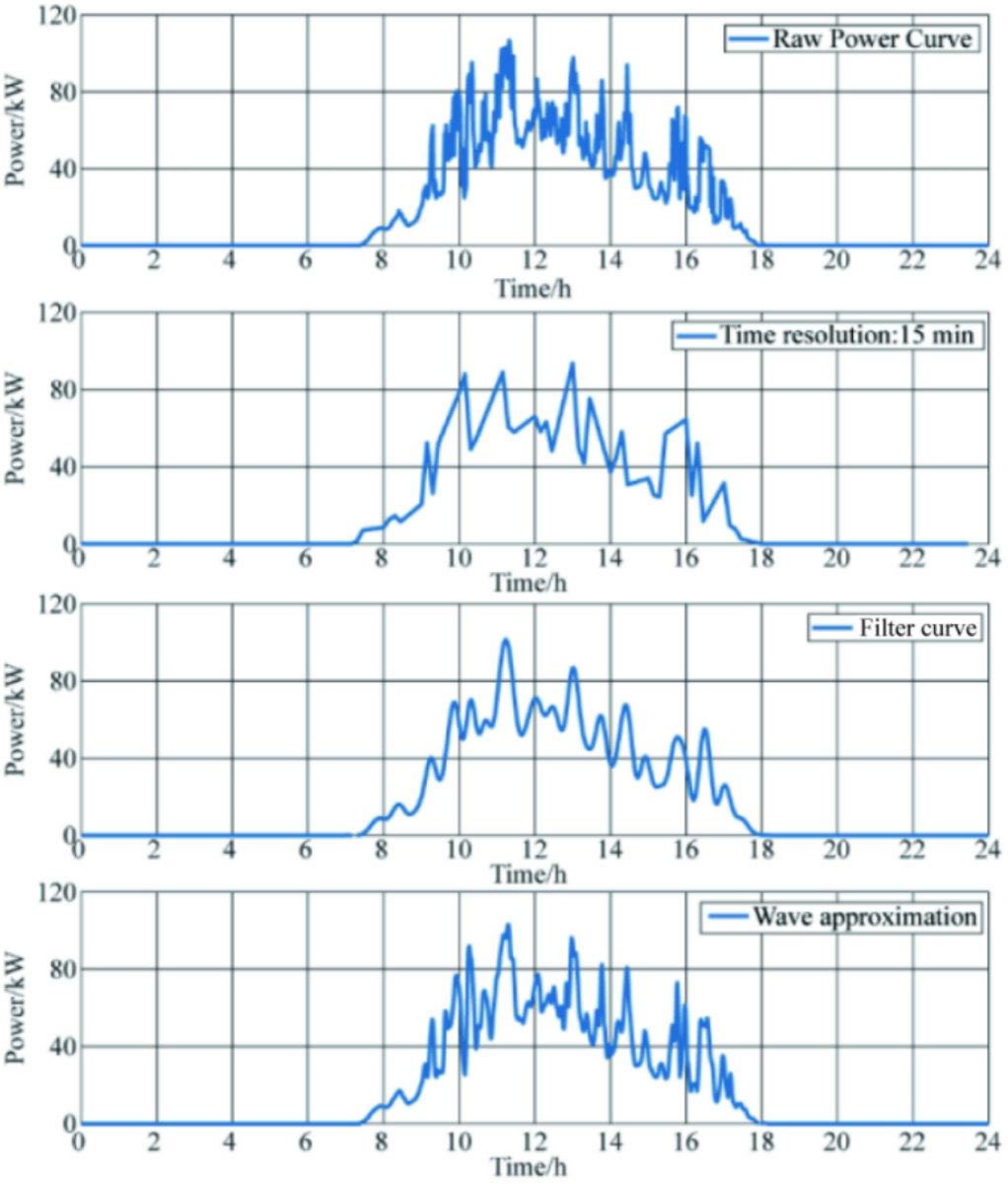 Fig.9 depicts the raw power data at the minute level,the daily measured power of the PV plant with a sampling step of 15 min and the power curve after the low-pass filter,along with the approximate curve reconstructed via wavelet decomposition, as shown in Eq.(12).The comparison results demonstrated that the 15 min and filtered power curves can effectively reflect the overall trend of the PV power curve; however, they cannot represent the shortterm fluctuations of the PV power curve.Conversely, the approximate horizontal curve obtained through wavelet transformation of the daily power high-frequency data makes it easier to analyze the fluctuation of the PV power generation.Therefore,the wavelet decomposition is used to fit the curve to reduce the workload while considering the accuracy of analyzing the approximate output power of each time period of a certain day.