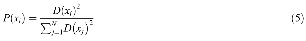 The next center of mass is then selected based on the probability of the square of the distance.That is,the sample furthest away from the current set of centers of mass is more likely to be selected as the new center of mass.The probability is calculated as follows: