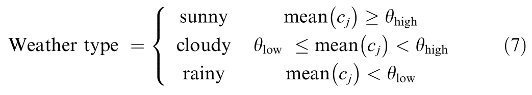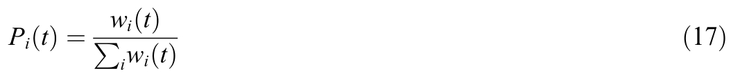 The normalization process yields the probabilities, i.e.,the weight of each weather divided by the weight of the three types of weather added together, where i = 1, 2, 3 corresponds to sunny, cloudy, and rainy weather,respectively: