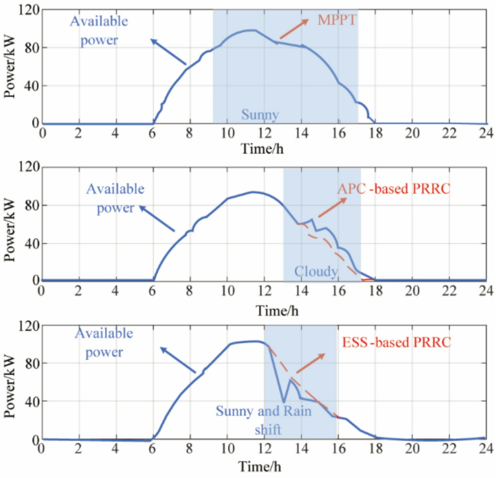 Calculating the results using the proposed method contributes significantly to PRRC strategy selection and parameter optimization(e.g.,ESS capacity storage allocation and APC power reserve ΔP)under different time zones and weather conditions.