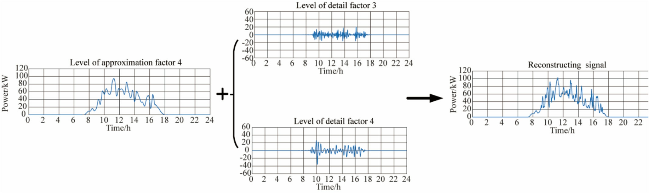 The wavelet approximation coefficients after four levels of decomposition retain the general trend of the power,and the detail coefficients of the third and fourth levels reflect the fluctuations within a specific time period.The approximation curve of the wavelet obtained after the three reconstructions comprises the approximation of the signal trend and some details of the fluctuations, which can be used as an approximation curve of the daily output power[40].Fig.8 depicts a schematic of the wavelet reconstruction after decomposition.