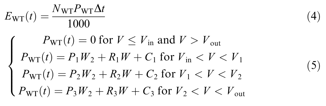 where NWT denotes the number of wind turbines, PWT denotes the power output of the wind turbine, W denotes the wind turbine’s mechanical speed, V out denotes the break-out speed, V in denotes the break-in speed, and P,R, and C denote the coefficients of the characteristic equations.