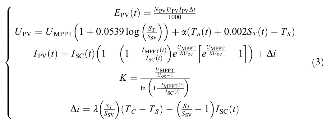 .TS denotes the BP350 solar panels, and ST denotes the total solar radiation on the tilted panel (W/m2).SSV denotes the standard radiation value(1000 W/m2),and Ta t denotes the temperature’s variable.ISC t denotes the short-circuit current (A), and IMPPT t denotes the current at the point of peak power (A)Uoc denotes the open-circuit voltage(V),and λ denotes the current temperature coefficient