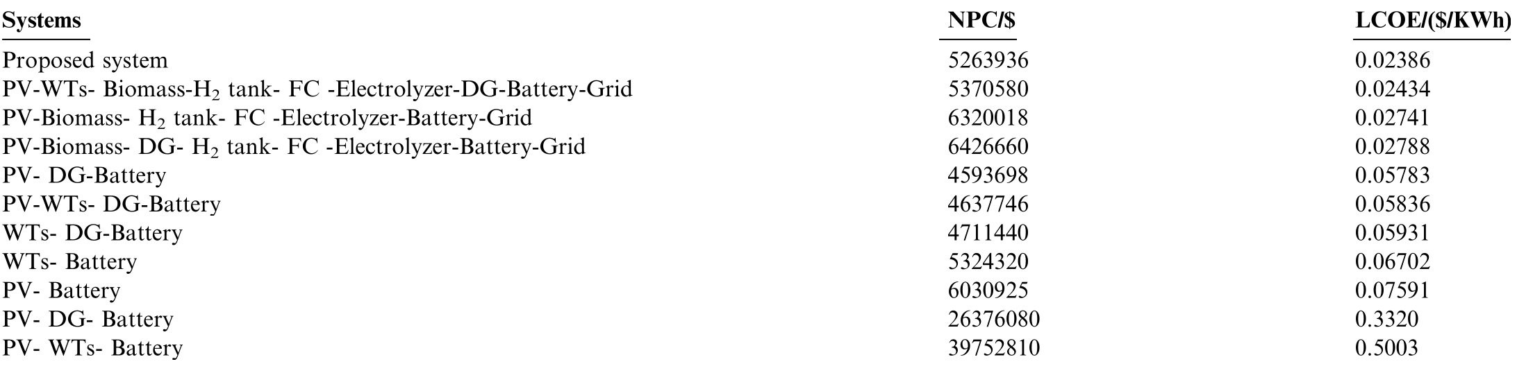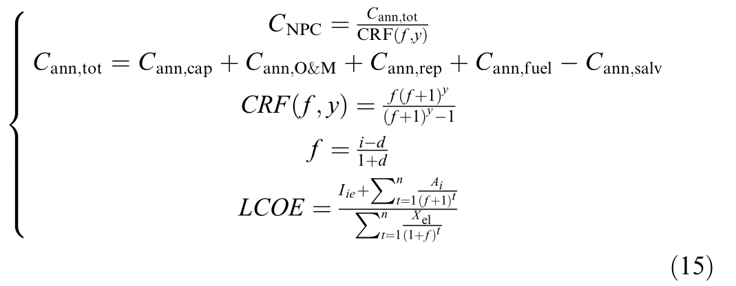 To achieve the objective of producing economically viable energy (affordable energy), the NPC and LCOE must be analyzed as follows [58,59]: