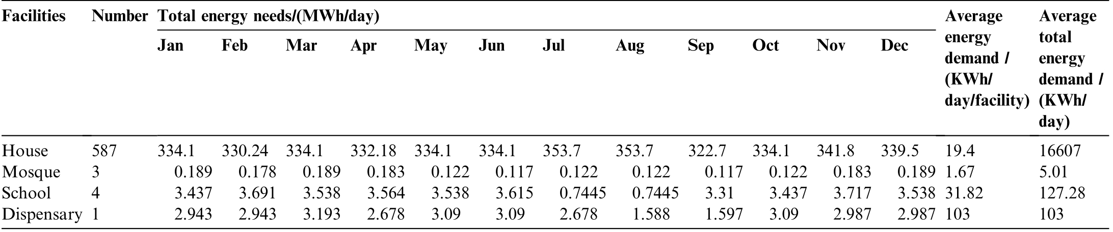 FacilitiesNumber Total energy needs/(MWh/day)Average energy demand /(KWh/day/facility)JanFebMarAprMayJunJulAugSepOctNovDec Average total energy demand /(KWh/day)House587334.1330.24 334.1332.18 334.1334.1353.7353.7322.7334.1341.8339.519.416607 Mosque30.1890.1780.1890.1830.1220.1170.1220.1220.1170.1220.1830.189 1.675.01 School43.4373.6913.5383.5643.5383.6150.74450.74453.313.4373.7173.538 31.82127.28 Dispensary 12.9432.9433.1932.6783.093.092.6781.5881.5973.092.9872.987 103103