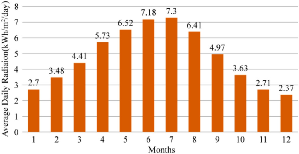 The study location experiences a high amount of solar radiation.Fig.4 depicts the monthly variations in the daily solar radiation, with July reaching a peak of 7.3 kWh/m2/day and December recording the lowest value at 2.73 kWh/m2/day.The average annual solar radiation rate is estimated at 4.78 kWh/m2/day.These figures are derived from the 22-year solar radiation dataset established by NASA (1983-2005),which ensures the accuracy and reliability of the results.