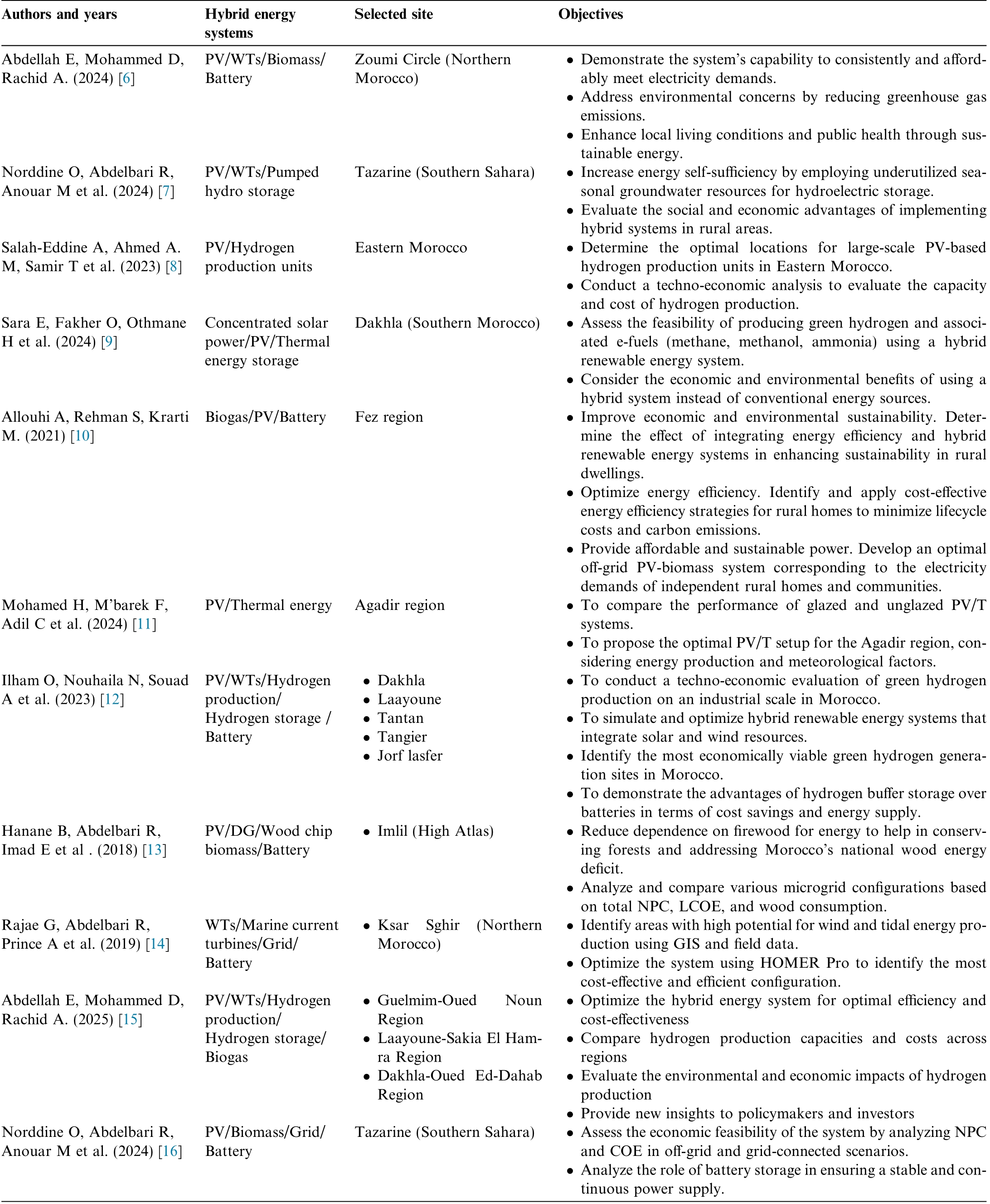 Authors and yearsHybrid energy systems Selected siteObjectives Abdellah E, Mohammed D,Rachid A.(2024) [6]Demonstrate the system’s capability to consistently and affordably meet electricity demands.Address environmental concerns by reducing greenhouse gas emissions.Enhance local living conditions and public health through sustainable energy.Norddine O, Abdelbari R,Anouar M et al.(2024) [7]PV/WTs/Biomass/Battery Zoumi Circle (Northern Morocco)Tazarine (Southern Sahara)Increase energy self-sufficiency by employing underutilized seasonal groundwater resources for hydroelectric storage.Evaluate the social and economic advantages of implementing hybrid systems in rural areas.Salah-Eddine A, Ahmed A.M, Samir T et al.(2023) [8]PV/WTs/Pumped hydro storage Eastern MoroccoDetermine the optimal locations for large-scale PV-based hydrogen production units in Eastern Morocco.Conduct a techno-economic analysis to evaluate the capacity and cost of hydrogen production.Sara E, Fakher O, Othmane H et al.(2024) [9]PV/Hydrogen production units Dakhla (Southern Morocco)Assess the feasibility of producing green hydrogen and associated e-fuels (methane, methanol, ammonia) using a hybrid renewable energy system.Consider the economic and environmental benefits of using a hybrid system instead of conventional energy sources.Allouhi A,Rehman S,Krarti M.(2021) [10]Concentrated solar power/PV/Thermal energy storage Biogas/PV/BatteryFez regionImprove economic and environmental sustainability.Determine the effect of integrating energy efficiency and hybrid renewable energy systems in enhancing sustainability in rural dwellings.Optimize energy efficiency.Identify and apply cost-effective energy efficiency strategies for rural homes to minimize lifecycle costs and carbon emissions.Provide affordable and sustainable power.Develop an optimal off-grid PV-biomass system corresponding to the electricity demands of independent rural homes and communities.Mohamed H, M’barek F,Adil C et al.(2024) [11]PV/Thermal energyAgadir regionTo compare the performance of glazed and unglazed PV/T systems.To propose the optimal PV/T setup for the Agadir region,considering energy production and meteorological factors.Ilham O,Nouhaila N,Souad A et al.(2023) [12]To conduct a techno-economic evaluation of green hydrogen production on an industrial scale in Morocco.To simulate and optimize hybrid renewable energy systems that integrate solar and wind resources.Identify the most economically viable green hydrogen generation sites in Morocco.To demonstrate the advantages of hydrogen buffer storage over batteries in terms of cost savings and energy supply.Hanane B, Abdelbari R,Imad E et al.(2018) [13]PV/WTs/Hydrogen production/Hydrogen storage /Battery Dakhla Laayoune Tantan Tangier Jorf lasfer Imlil (High Atlas)Reduce dependence on firewood for energy to help in conserving forests and addressing Morocco’s national wood energy deficit.Analyze and compare various microgrid configurations based on total NPC, LCOE, and wood consumption.Rajae G, Abdelbari R,Prince A et al.(2019) [14]PV/DG/Wood chip biomass/Battery Identify areas with high potential for wind and tidal energy production using GIS and field data.Optimize the system using HOMER Pro to identify the most cost-effective and efficient configuration.Abdellah E, Mohammed D,Rachid A.(2025) [15]WTs/Marine current turbines/Grid/Battery Ksar Sghir (Northern Morocco)Optimize the hybrid energy system for optimal efficiency and cost-effectiveness Compare hydrogen production capacities and costs across regions Evaluate the environmental and economic impacts of hydrogen production Provide new insights to policymakers and investors Norddine O, Abdelbari R,Anouar M et al.(2024) [16]PV/WTs/Hydrogen production/Hydrogen storage/Biogas Guelmim-OuedNoun Region Laayoune-Sakia El Hamra Region Dakhla-Oued Ed-Dahab Region PV/Biomass/Grid/Battery Tazarine (Southern Sahara)Assess the economic feasibility of the system by analyzing NPC and COE in off-grid and grid-connected scenarios.Analyze the role of battery storage in ensuring a stable and continuous power supply.