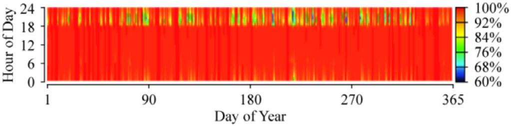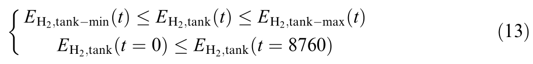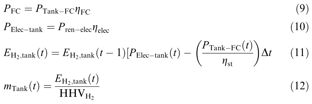 where ηFC denotes the efficiency of the fuel cell, and PTank FC denotes the output power of the fuel cell, ηelec denotes the electrolyzer efficiency, which was assumed to be constant.ηst denotes the efficiency of hydrogen storage as approximately 95%for all the operating conditions,and HHVH2 denotes the hydrogen storage higher-heating value, which was considered to be 38.9 kWh/kg [56].