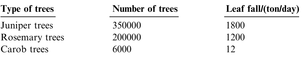 Type of treesNumber of treesLeaf fall/(ton/day)Juniper trees3500001800 Rosemary trees2000001200 Carob trees600012