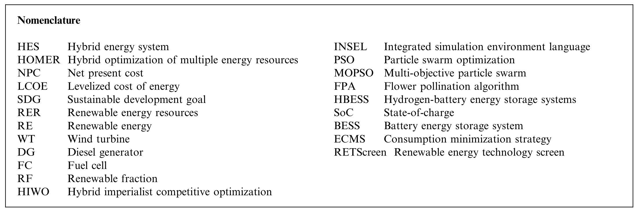 Babangida M et al.[25] analyzed the optimization of hybrid hydrogen and battery storage within gridconnected RE microgrids, emphasizing improvements in cost efficiency and operational reliability through tailored energy management strategies adapted to various electricity pricing models.The integration of hydrogen storage ensures long-term energy stability, enhances the grid performance, and supports sustainable practices by reducing the carbon emissions.Similarly, Abdin Z et al.[26] analyzed efficient hybrid RE systems for off-grid power supply and hydrogen production, incorporating solar, wind, and hydrogen technologies.They demonstrated the advantages of using hydrogen for long-term energy storage, with cost variations influenced by various regional conditions.Ensuring reliability is crucial for the smooth operation of RE systems.In [27,28], hybrid RE systems were analyzed by combining solar power and biomass for electrifying remote areas in Saudi Arabia to optimize the systems while minimizing the costs.Similarly, [29,30] focused on optimizing the solar-biomass systems in Egypt, one for a grid-connected village and the other for an off-grid farm microgrid, utilizing hybrid imperialist competitive optimization (HIWO) and particle swarm optimization(PSO), respectively.On a broader scale, [31,32] analyzed the optimization of hybrid renewable systems, balancing the cost-effectiveness and reliability amid grid instability and environmental challenges.Additionally, [33,34]enhanced the efficiency and reliability of hybrid systems,one using solar, wind, and hydrogen technologies for a university campus and the other combining photovoltaic(PV) and biomass systems for rural areas.[35,36] focused on optimizing off-grid hybrid systems, applying multiobjective particle swarm optimization (MOPSO) for biomass and fuel cells and the flower pollination algorithm(FPA)for PV and fuel cells,emphasizing the cost,reliability,and sustainability.Lastly, [37,38]analyzed sustainable energy solutions, including hybrid solar-battery systems for grid stability and water electrolysis for green hydrogen production, respectively.The incorporation of hydrogen storage enhances the grid performance, provides a reliable backup source of energy, and maintains a steady power supply, particularly in regions where RE sources exhibit variability.