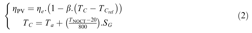 where β denotes the temperature index for silicon PV cells that remains constant, ηe denotes the reference efficiency for solar modules, TC denotes the temperature of the PV cell
