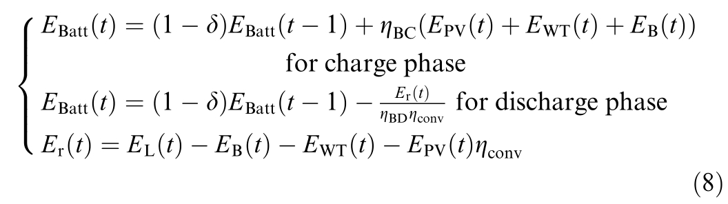 where EBatt t denotes the storage of the battery (kWh),and δdenotes the hourly self-discharging rate of the battery.EPV t ,EWT t ,and EB t denote the excess generation of the PV system, wind, and biomass generators after fulfilling the energy demand,respectively.(kWh).ηBC denotes the efficiency of the battery during charging, and ηBD denotes the discharging rate of the battery.ηconv denotes the efficiency of the converter, EL t denotes the total energy demand, and Er t denotes the energy required to meet the load demand, which was not satisfied by renewable generation.