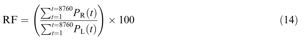 To establish a reliable energy system, the grid is integrated as a supplementary source to address system failures, unexpected breakdowns, or unforeseen spikes in the energy demand.However, this study focuses on maximizing the efficiency of RE components and on eliminating the reliance on the grid.The RF is used to evaluate the share of electricity generated from renewable resources.An RF value of 100% indicates that all the electricity is produced from renewable resources without depending on the grid.Achieving this target ensures the dual benefits of sustainable and reliable energy.The RF is calculated as follows [57]: