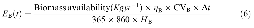 where ηBdenotes the overall efficiency of the biomass generator, CVB denotes the calorific value of biomass (kcal/kg) used to convert kcal to kWh (1 kcal is equivalent to 860 kWh), Δt denotes the duration of biomass generator energy operation within a day, and HB denotes the daily operational hours of the biomass generator power.