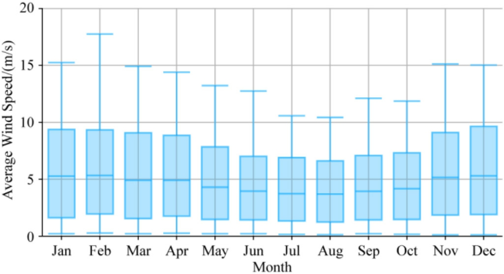 The study area experiences notable wind speeds that are well-suited for energy generation.At a height of 30 m,the peak average wind speeds were observed in January and December, reaching 5.32 m/s, whereas the lowest average speed, 3.68 m/s, was recorded in August.These results are derived from 30 years of wind speed data (1984-2013)sourced from NASA,as shown in Fig.5,which outlines the monthly average wind speeds.
