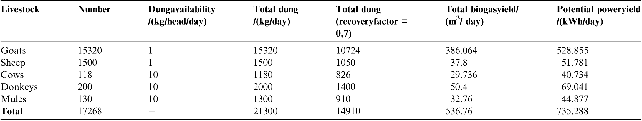 LivestockNumberDungavailability/(kg/head/day)Total dung/(kg/day)Total dung(recoveryfactor =0,7)Total biogasyield/(m3/ day)Potential poweryield/(kWh/day)Goats1532011532010724386.064528.855 Sheep150011500105037.851.781 Cows11810118082629.73640.734 Donkeys200102000140050.469.041 Mules13010130091032.7644.877 Total172682130014910536.76735.288